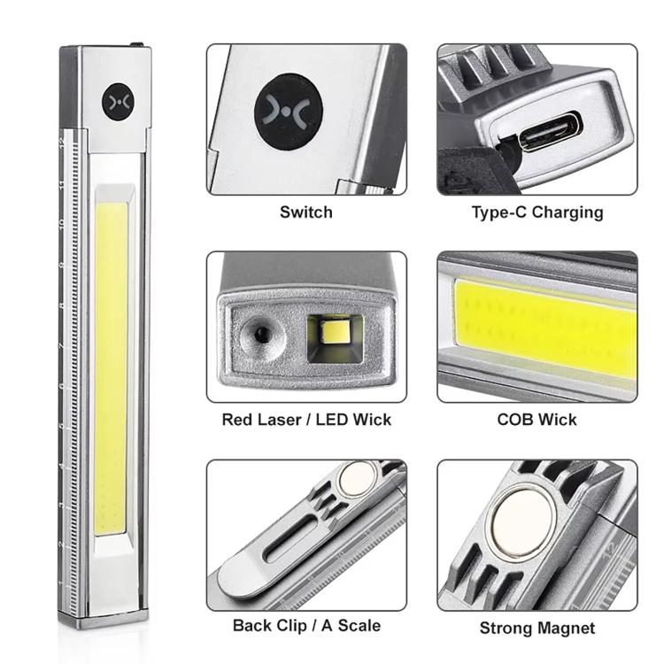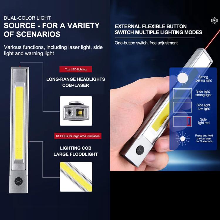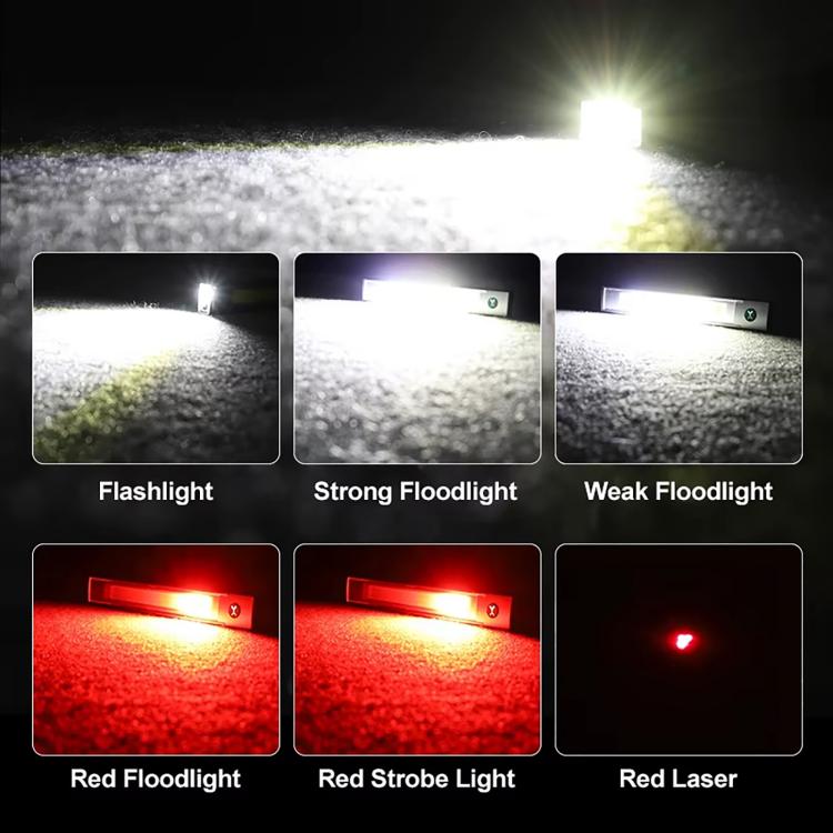 4. Lighting mode: COB strong light - COB weak light - red light - red light flash - long press red laser