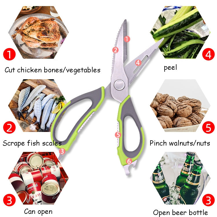 2. Multifunctional use: cut chicken bones/vegetables, peel/scrape fish scales/pinch walnuts, nuts/open cans/open beer bottles