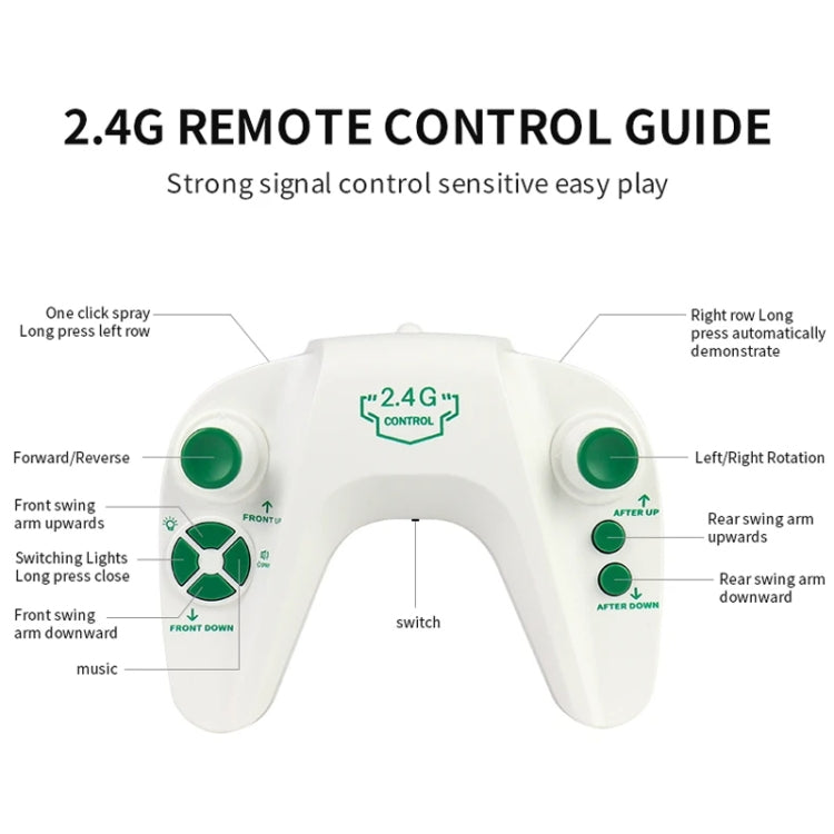 7. Product features: four-wheel drive, forward, backward, left and right drift, colorful lights, music, spray, left and right sidewalk loading items, front and rear swinging arm climbing, gesture control, walkthrough, light mode switching