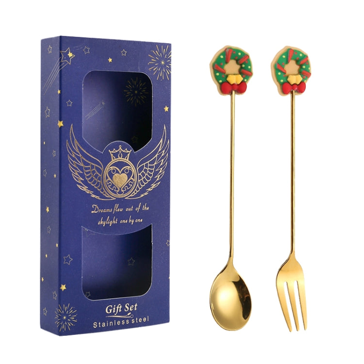 2pcs /Pack Christmas Gift Spoon Cartoon Fruit Fork Dessert Coffee Scoop, Style: Wreath (Blue Box)