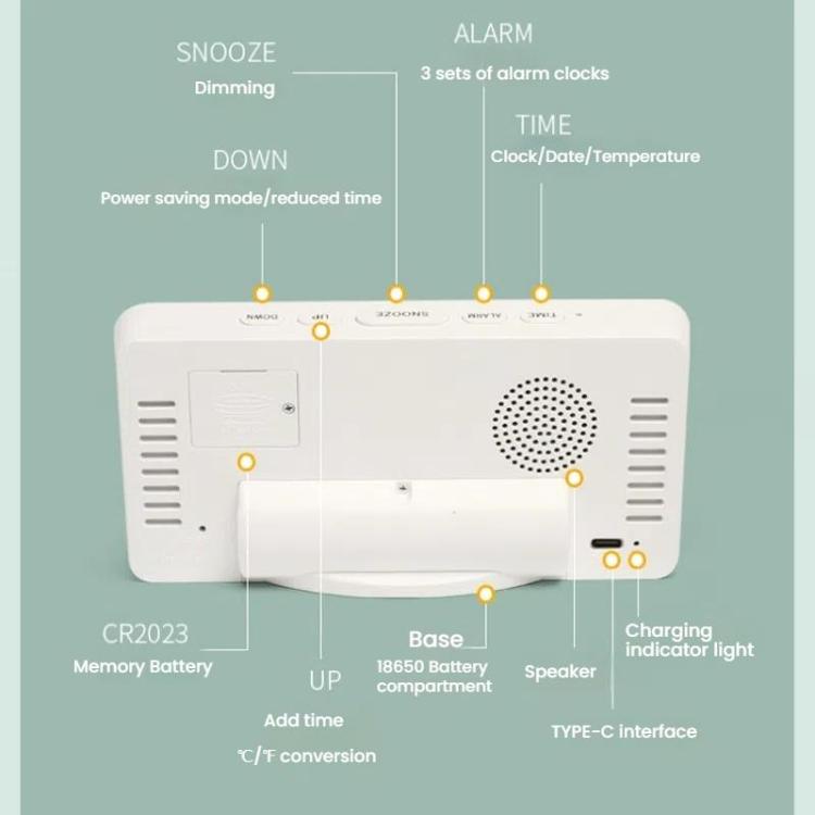 2. Functions: time, date, temperature, snooze alarm, memory, brightness adjustment, 18650 battery compartment, weekday alarm