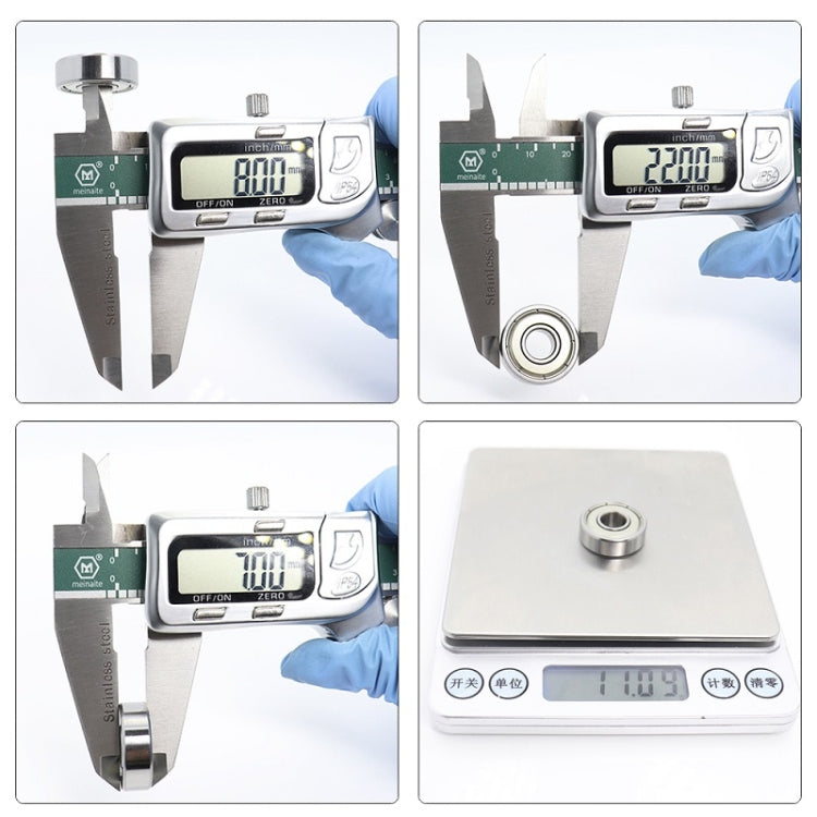 7. 608zz: القطر الداخلي 8 مللي متر، القطر الخارجي 22 مللي متر، العرض 7 مللي متر