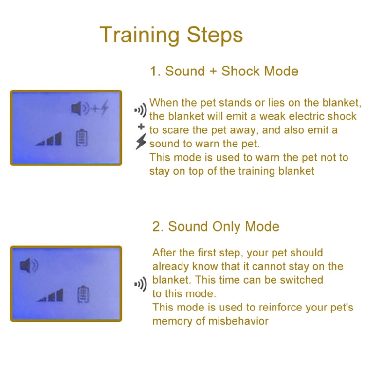 1. وضع الصوت + الصدمة الكهربائية: عندما يقف الحيوان الأليف على بطانية التدريب، أو يستلقي عليها، سترسل بطانية التدريب صدمة كهربائية ضعيفة لتخويف الحيوان الأليف بعيدًا، وسوف ترسل أيضًا صوتًا لإعطاء الحيوان الأليف صوتًا. تحذير؛ يُستخدم هذا الوضع لتحذير الحيوان الأليف من عدم قدرته على البقاء على بطانية التدريب