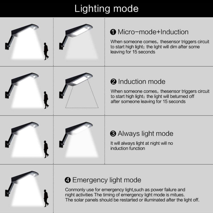 4. Emergency light mode, commonly use for emergency lighting, such as power failure and night activities, the timing of emergency light mode is 30 minutes, the solar panels should be restarted or illuminated after the lights off