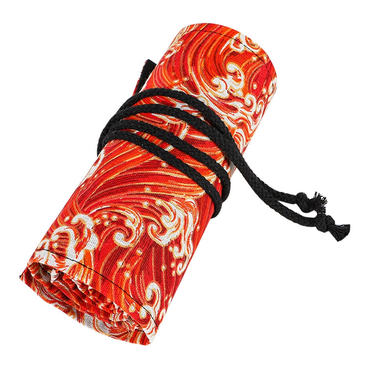 Golden Red Sea Wave Printing Roller Pencil Case Large Capacity Pencilcase Canvas Big Pen Bag(24 Holes)
